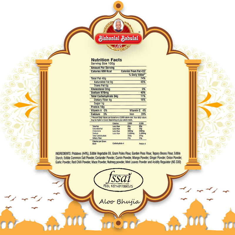 – Ingredients : Potatoes, Edible Vegetable Oil, Gram Pulses Flour, Garden Peas Flour, Tepary Beans Flour, Edible Starch, Edible Common Salt Powder, Coriander Powder, Cumin Powder, Mango Powder, Ginger Powder, Onion Powder, Garlic Powder, Red Chilli Powder, Mace Powder, Nutmeg Powder, Mint Leaves Powder and Acidity Regulator (NS330).