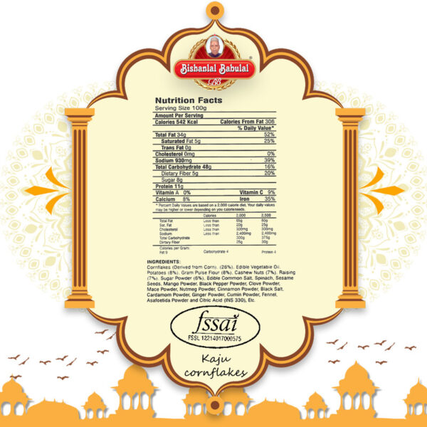 – Ingredients : Cornflakes, Edible Vegetable Oil, Potatoes, Gram Pulse Flour, Cashew nuts, Raisin, Sugar Powder, Edible Common Salt, Spinach, Sesame Seeds, Mango Powder, Black Pepper Powder, Clove Powder, Mace Powder, Nutmeg Powder, Cinnamon Powder, Black Salt, Cardamom Powder, Ginger Powder, Cumin Powder, Fennel, Asafoetida Powder and Citric Acid (INS 330).